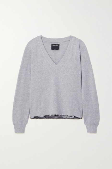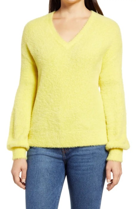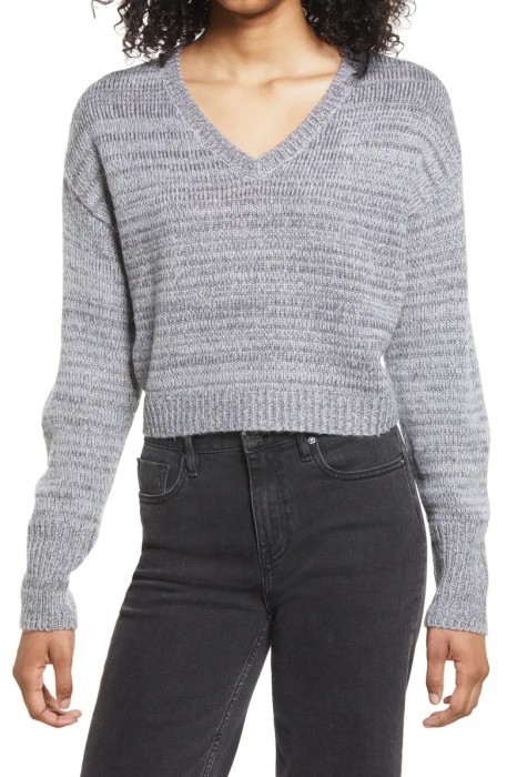 Wear thsi cropped sweater with high waisted jeans and yellow sneakers
